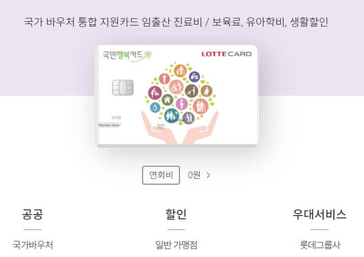 업종 적용 대상 혜택 조건 통신 통신비 2만원 할인 월1회 자동이체시 학습 어린이집 및 유치원 학비 10% 할인 월 매출 5만원내에서 5천원 까지 할인 교육 학습지, 학원 등 5% 할인 월 1만원 까지 할인 키즈 키자니아, 토이저러스 7개 지점 30% 할인 잠실, 중계, 평촌, 천안아산, 율하, 수완, 킨텍스 놀이 놀이시설, 유원지 10% 할인 교통 대중교통, 택시 10% 할인 매입 다음달 할인 적용 병의원 병원, 약국, 산후조리원 5% 할인 월 5천원까지 할인 쇼핑 롯데몰, 롯데홈쇼핑, 인터파크, 지마켓, 옥션 등 5%할인 월 2회, 건당 5천원까지 할인 - 신한카드 - 신한카드 국민 행복