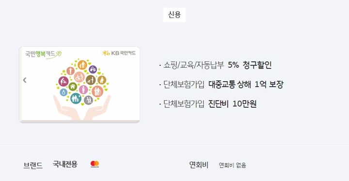 국민 행복 카드는 신용카드와 체크카드 모두 연회비가 면제로 가장 혜택이 큰 카드를 선택하셔서 발급 신청 하시면 됩니다.
