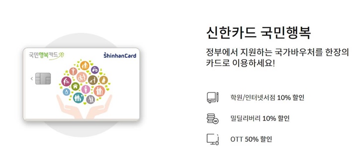 업종 적용 대상 혜택 조건 통신 통신비 2만원 할인 월1회 자동이체시 학습 어린이집 및 유치원 학비 10% 할인 월 매출 5만원내에서 5천원 까지 할인 교육 학습지, 학원 등 5% 할인 월 1만원 까지 할인 키즈 키자니아, 토이저러스 7개 지점 30% 할인 잠실, 중계, 평촌, 천안아산, 율하, 수완, 킨텍스 놀이 놀이시설, 유원지 10% 할인 교통 대중교통, 택시 10% 할인 매입 다음달 할인 적용 병의원 병원, 약국, 산후조리원 5% 할인 월 5천원까지 할인 쇼핑 롯데몰, 롯데홈쇼핑, 인터파크, 지마켓, 옥션 등 5%할인 월 2회, 건당 5천원까지 할인 - 신한카드 - 신한카드 국민 행복