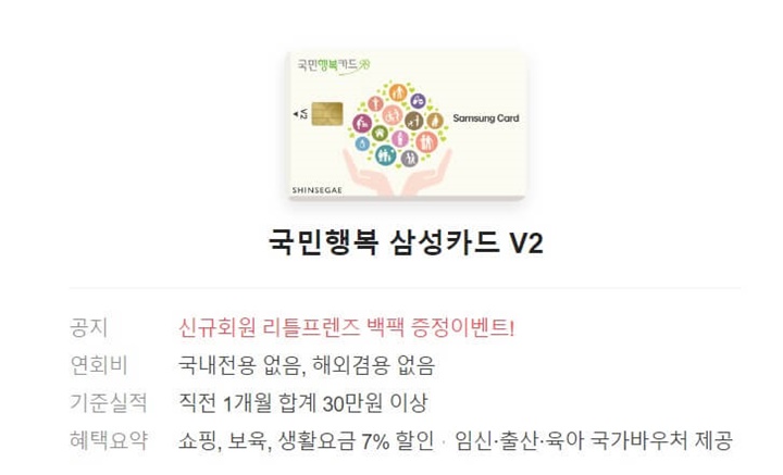국민 행복 카드는 신용카드와 체크카드 모두 연회비가 면제로 가장 혜택이 큰 카드를 선택하셔서 발급 신청 하시면 됩니다.