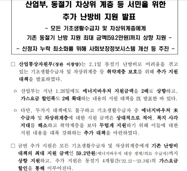 산업통상자원부는 '동절기 취약계층 보호 난방비 추가 지원 대책'을 발표내용을 살펴보면 난방비 추가 지원은 지난해 12월부터 3월까지의 동절기 기간의 가스요금 할인을 통해 지원을 확대하겠다고 했습니다