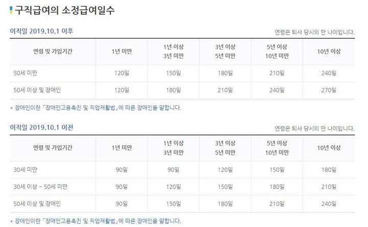 통상 50세 미만은 50세 이상 및 장애인 근로자보다 30일 정도 수급일이 적습니다. 현실적으로 50세 미만보다 재취업이 어렵기 때문에 수급일이 길게 설정되어 있습니다.