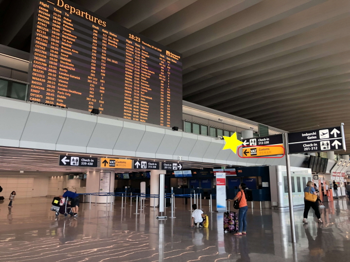 공항에 도착하면 먼저 체크인을 진행합니다. 이때, 구매한 물건을 세관에 보여줘야 하므로 물건이 들어있는 가방은 수하물로 보내지 않고, 나중에 보낸다고 얘기해야 합니다.
