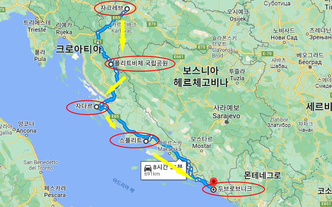 위의 지도에 표시해둔 대로 여행 일정을 7일로 잡았을 때 5개 도시 코스로 추천드립니다. 부지런히 움직이고 쉬는 시간을 줄인다면 크로아티아 안에서도 더 많은 도시들을 둘러볼 수도 있지만, 느낌이 비슷한 도시들이 많기 때문에 주요 도시만 여행하며 여유를 즐기셨으면 합니다.