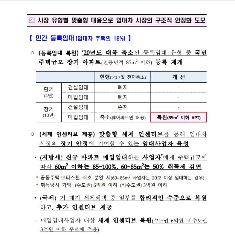 * 아파트 임대 사업자 등록 허용 -> 85㎡ 등록 임대부활(수도권 6억 이하, 비수도권 3억 이하)