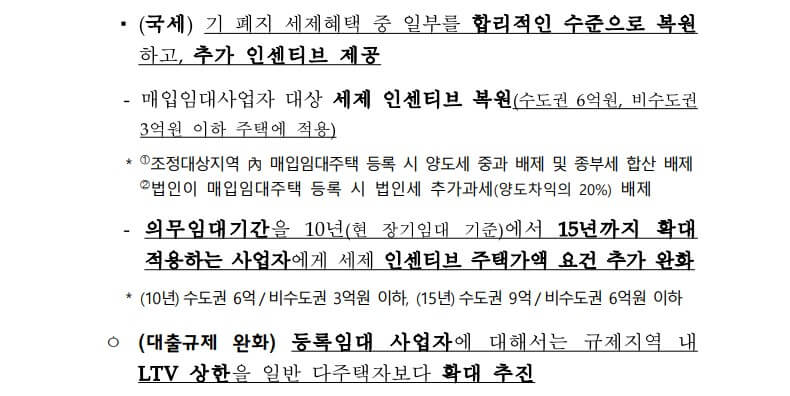 * 15년 장기 임대 인센티브 추가 제공(주택가격 수도권 9억 이하, 비수도권 6억 이하)