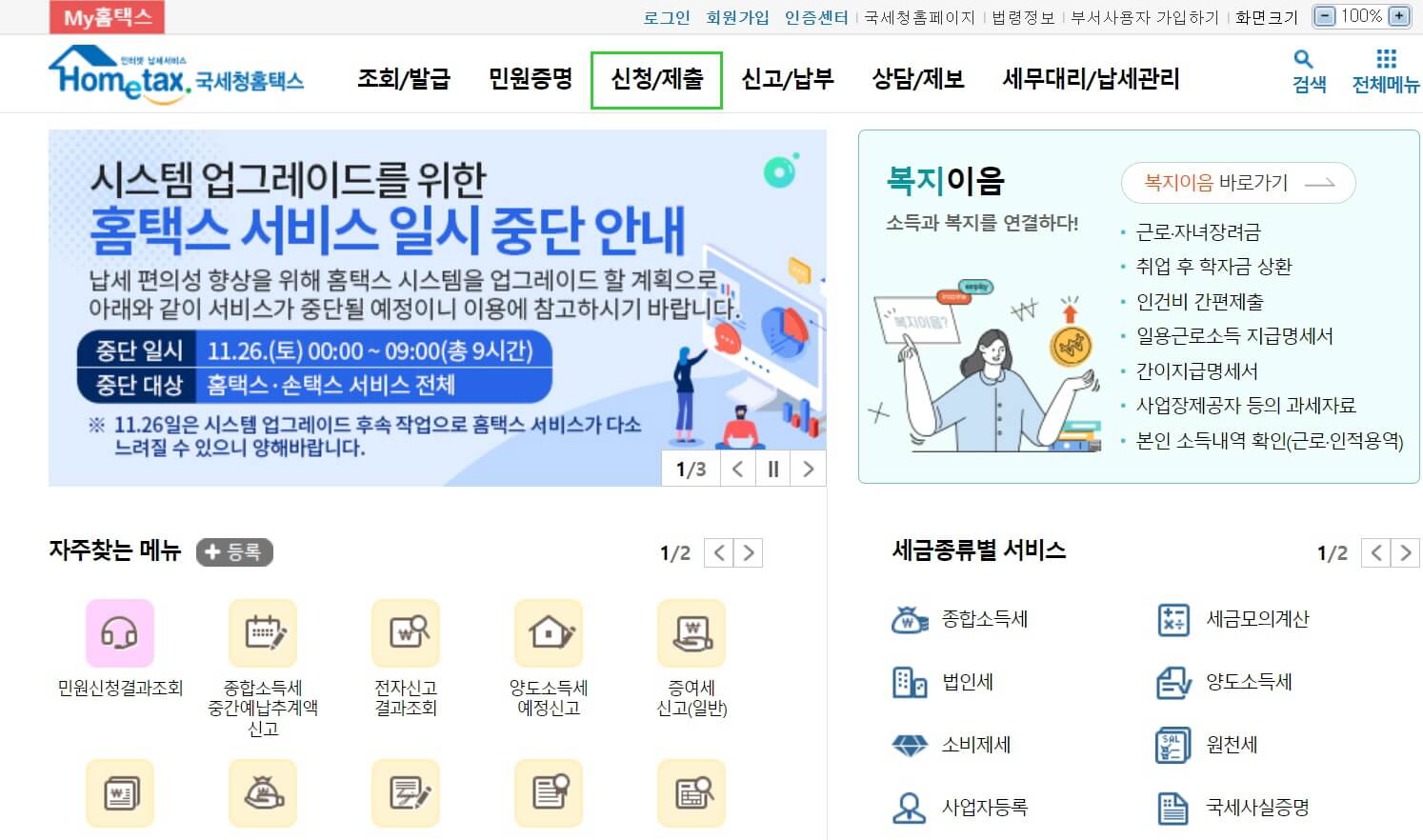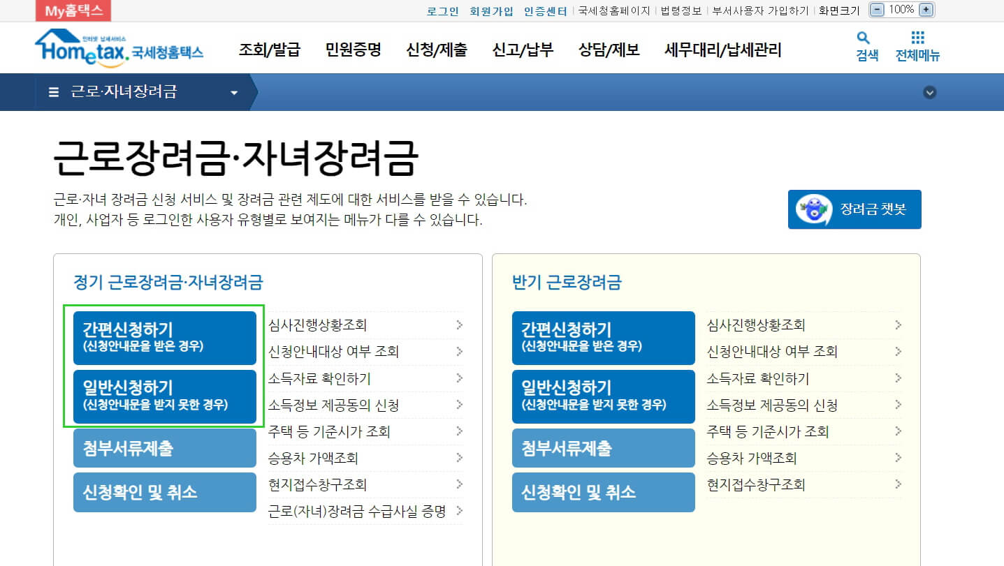 홈택스(www.hometax.go.kr) 접속 후 로그인 → 상단 메뉴 '신청/제출' →근로장려금·자녀장려금 → 간편시청하기 또는 일반신청하기