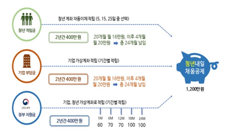 2년간 청년이 300만 원, 기업이 300만 원, 정부가 600만 원을 적립하여 만기 시 1200만 원의 목독을 마련할 수 있었던 정책이었으나 올해부터는 가입대상과 지원규모가 변경될 예정입니다.