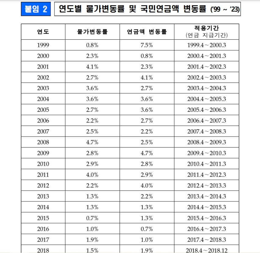 국민연금은 1999년부터 매년 물가변동률을 반영하여 연금 급여액을 인상해 왔습니다.