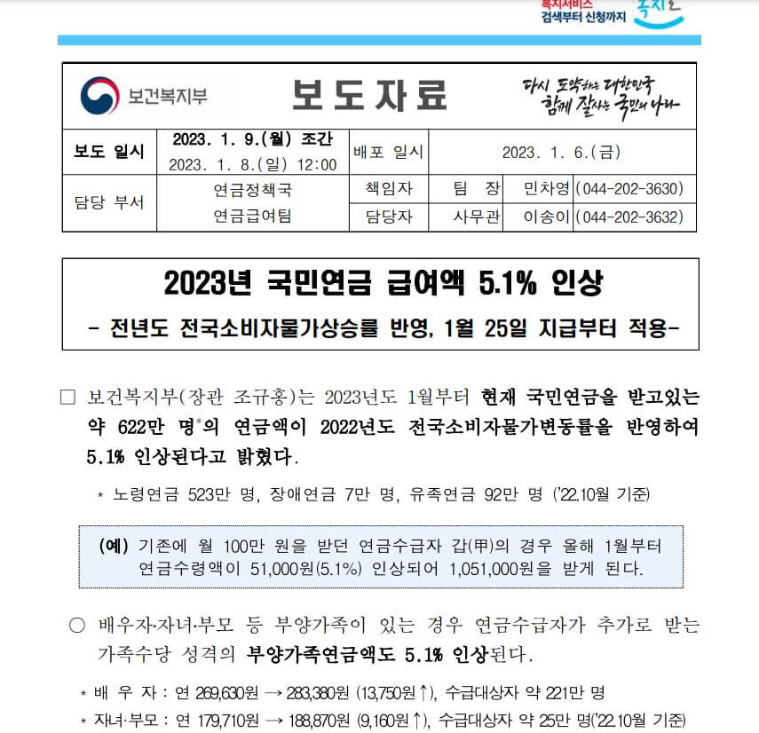 출처- 보건복지부 [1.9.월.조간]_2023년_국민연금_급여액_5.1%_인상.pdf0.57MB알림 > 보도자료 내용보기 " 2023년 국민연금 급여액 5.1% 인상 " | 힘이 되는 평생 친구, 보건복지부