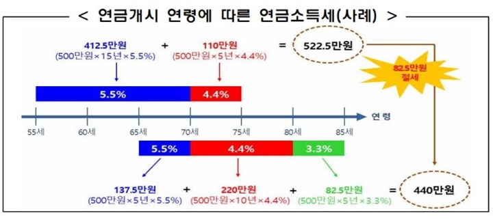 * 55세 이상 70세 미만 5.5%, 70세 이상 ~ 80세 미만 4.4%, 80세 이상 3.3%의 연금소득세 적용
