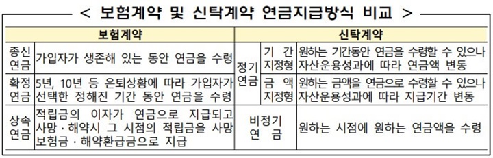* 신탁계약은 연금지급 이후에도 자신이 직접 적립금을 운용하고 종신연금은 보험사 상품으로 연금 개시 후에는 중도해지 및 내용 변경이 불가합니다.