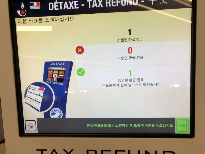 해당 택스리펀 회사 부스를 찾아갑니다. 서류 봉투에 있는 회사 이름을 찾으면 됩니다. 직원에게 여권과 서류를 보여주면 현금으로 받는다고 했을 시에는 그 자리에서 수수료(약 10%)를 뗀 금액을 현지 화폐 (유로)로 바로 받을 수 있습니다. 신용카드로 환급받는다고 한 경우에는 직원이 서류를 가져가거나, 다시 돌려준다면 주변에 있는 해당 회사 우체통에 서류가 들어있는 봉투를 넣으면 됩니다.
