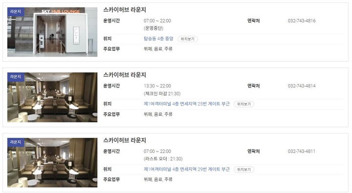 스카이 허브 라운지는 1 터미널에서 3개의 라운지를 운영했지만 현재는 탑승동은 운영중단된 상태로 서편과 동편만 각기 다른 시간대로 운영하고 있어 시간에 맞춰 이용해주셔야 합니다.